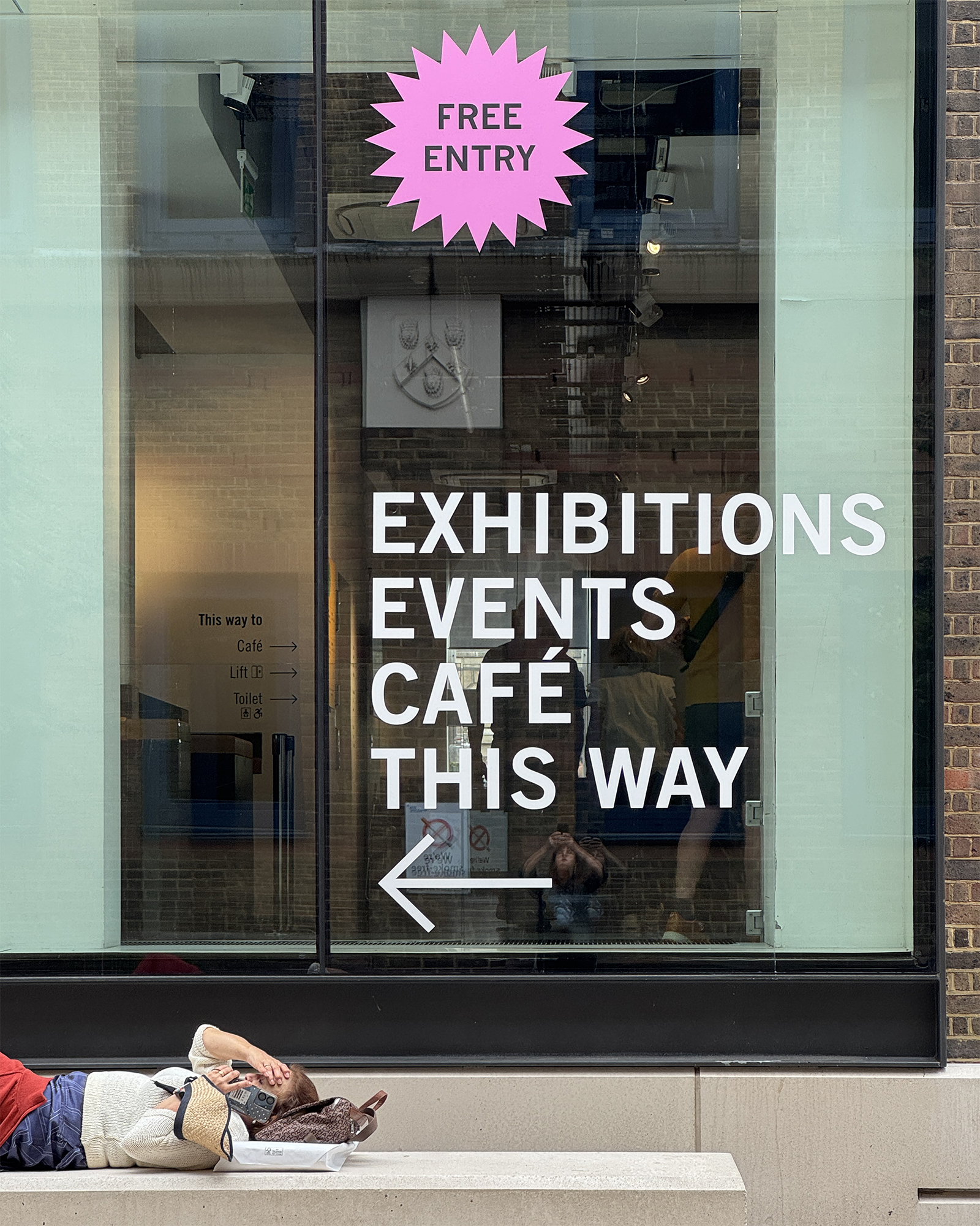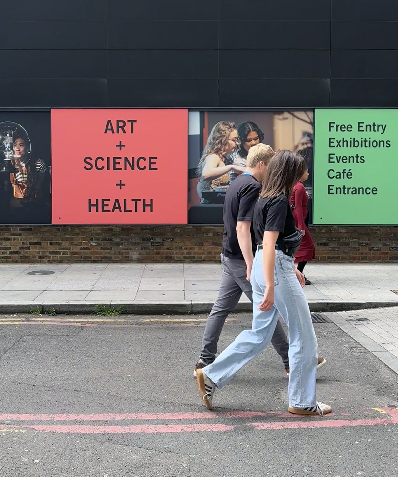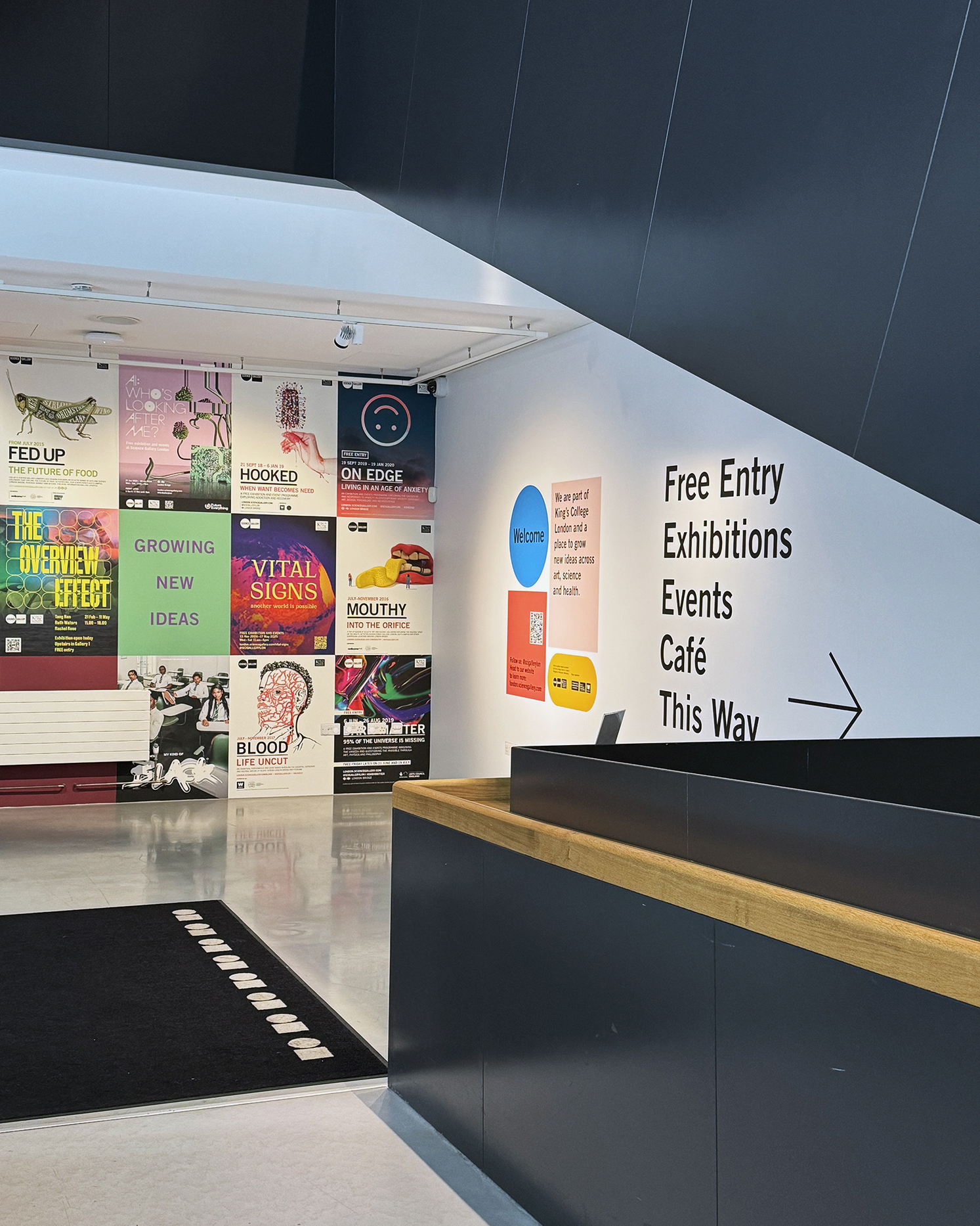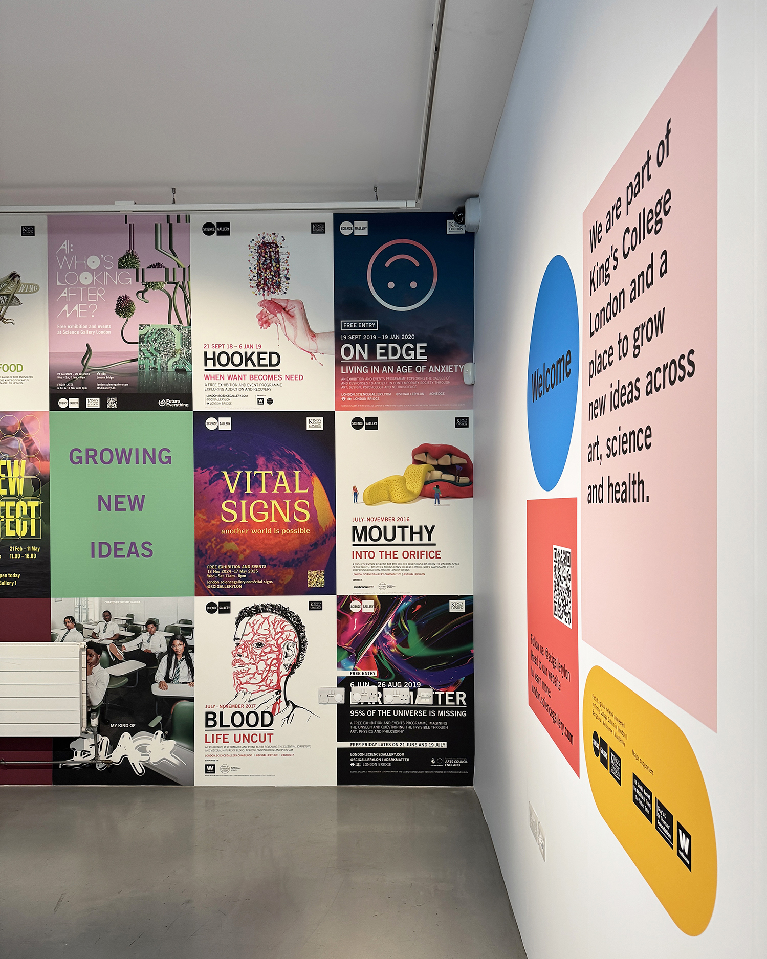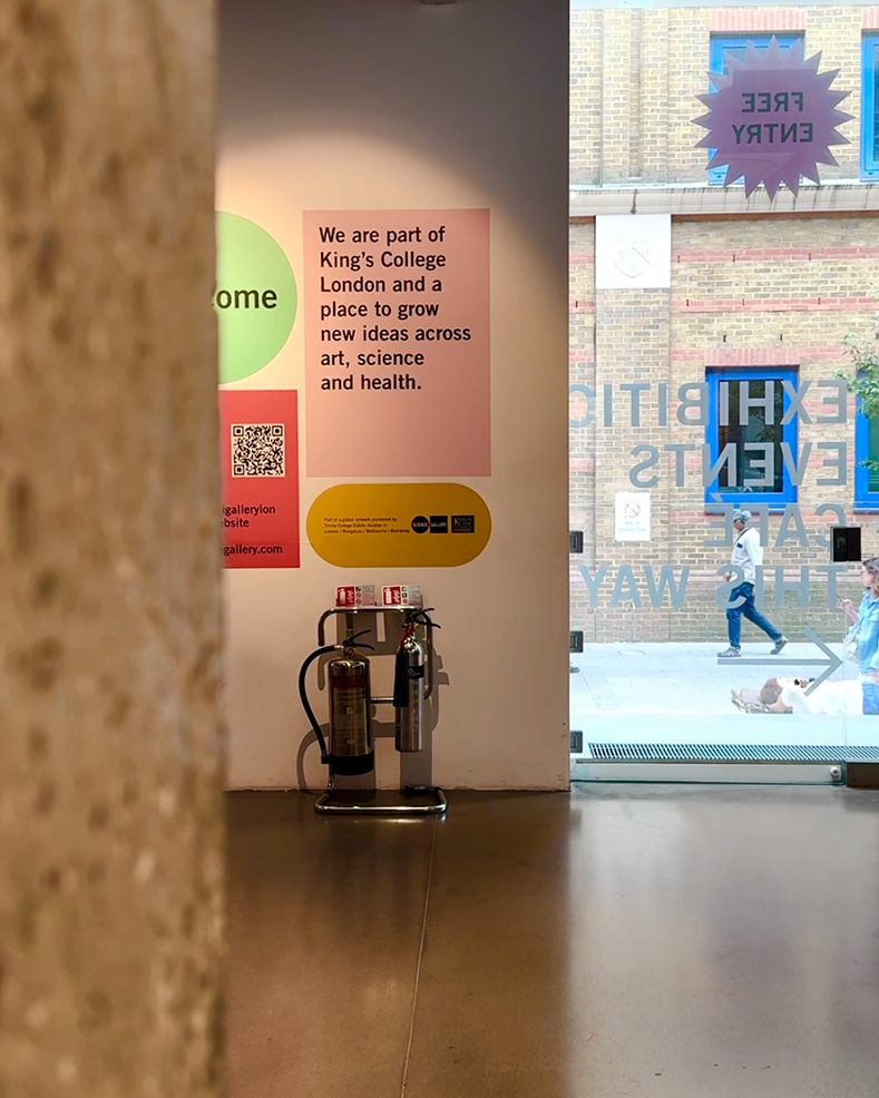 Large-scale graphics and signage for the Science Gallery London. Creating a welcoming new identity and presence for the gallery on the exterior, windows, entrance and café areas. Using graphic shapes and the SGL colour palette – alongside posters from previous years publicity – all of which are intended to work alongside graphics for a changing exhibition programme.